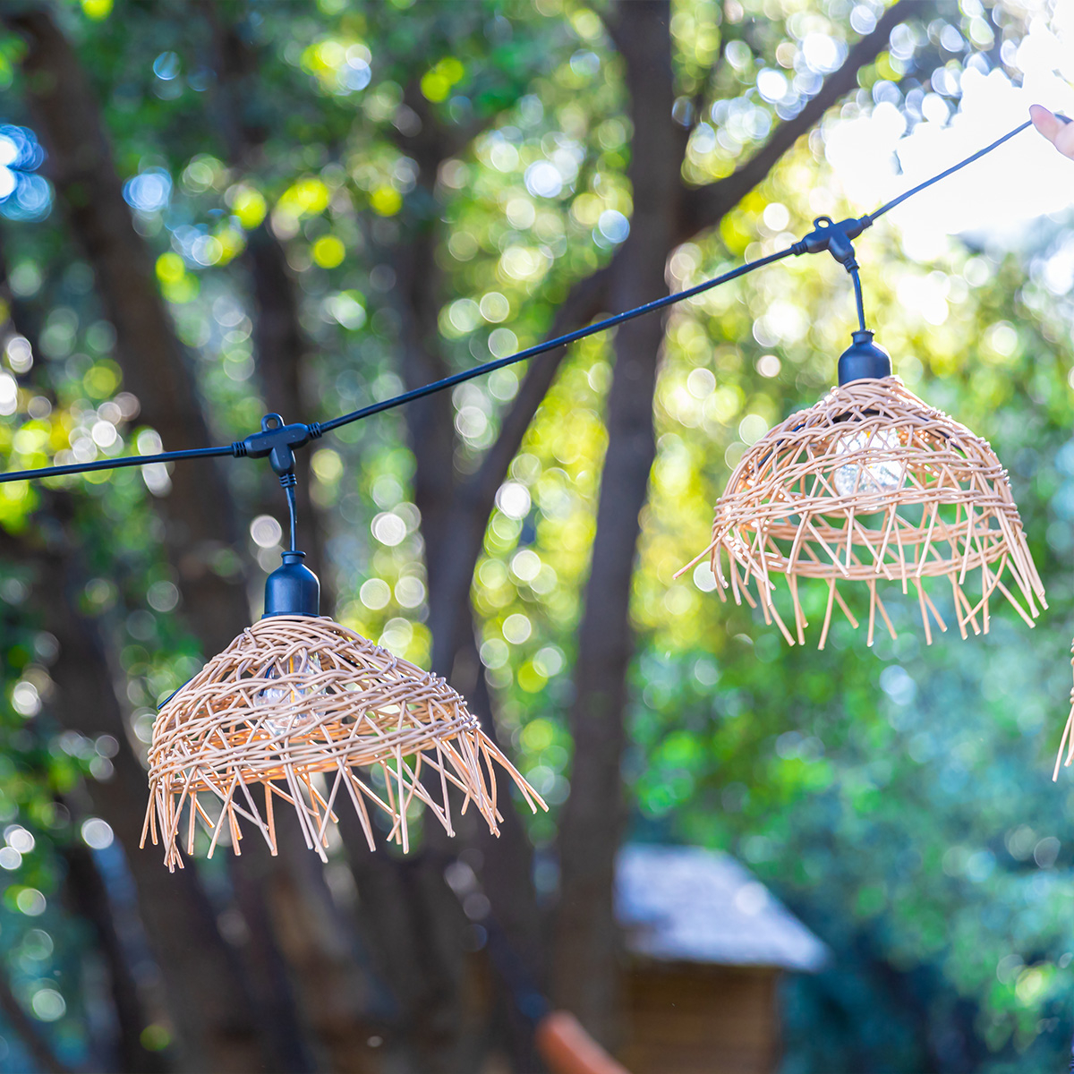 Ghirlandă luminoasă de exterior conectabilă de 6 m cu 10 becuri LED cu filament E27 alb cald și abajururi boeme din ratan, IP64