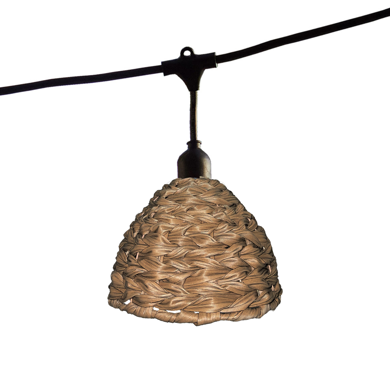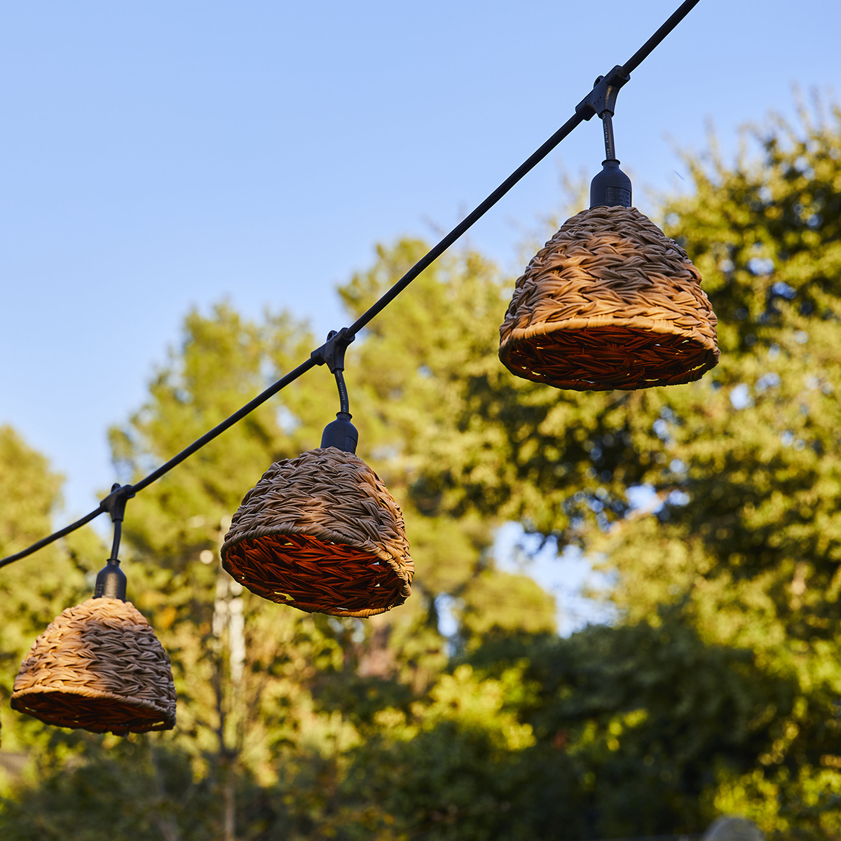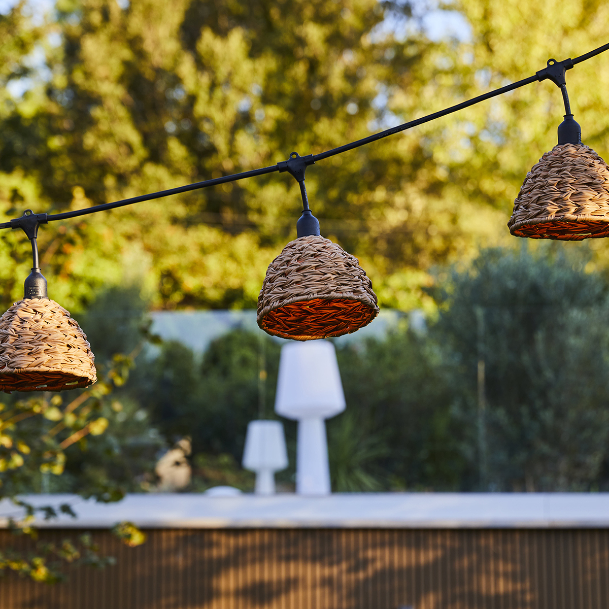 Ghirlandă luminoasă de exterior 6m, conectabilă cu abajururi din poliratan în stil boem, 7 becuri LED cu filament E27, alb cald, lumină blandă, IP64