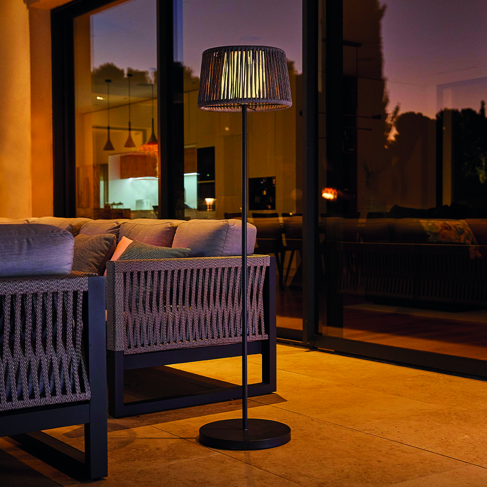 Construit din metal cu vopsea epoxidică și împletitură poliratan rezistentă la UV, lampadarul este certificat IP65, ceea ce îl face ideal pentru utilizare în exterior, indiferent de vreme.