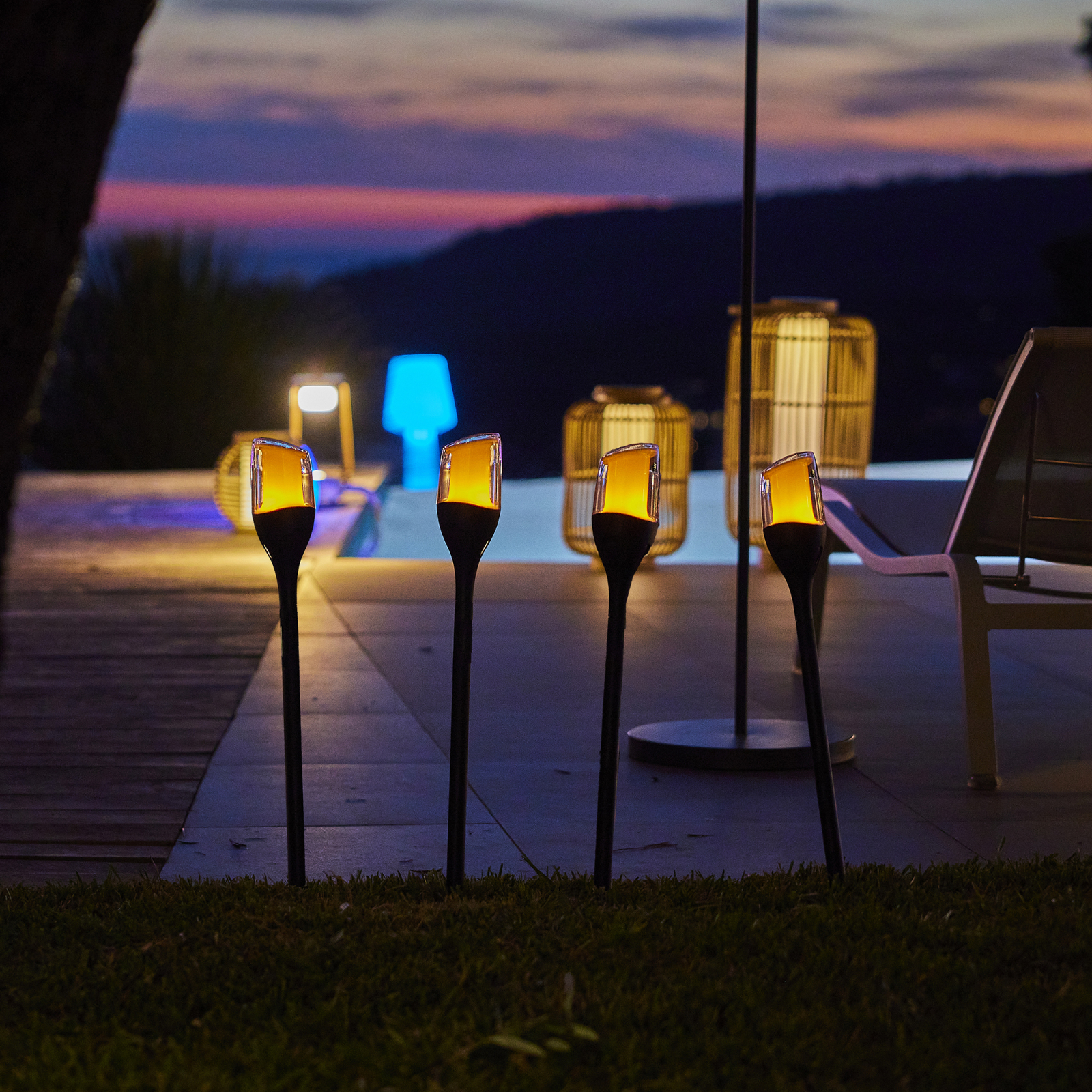 Datorită senzorului de crepuscul, torțele se aprind automat la lăsarea serii, fără intervenții suplimentare.