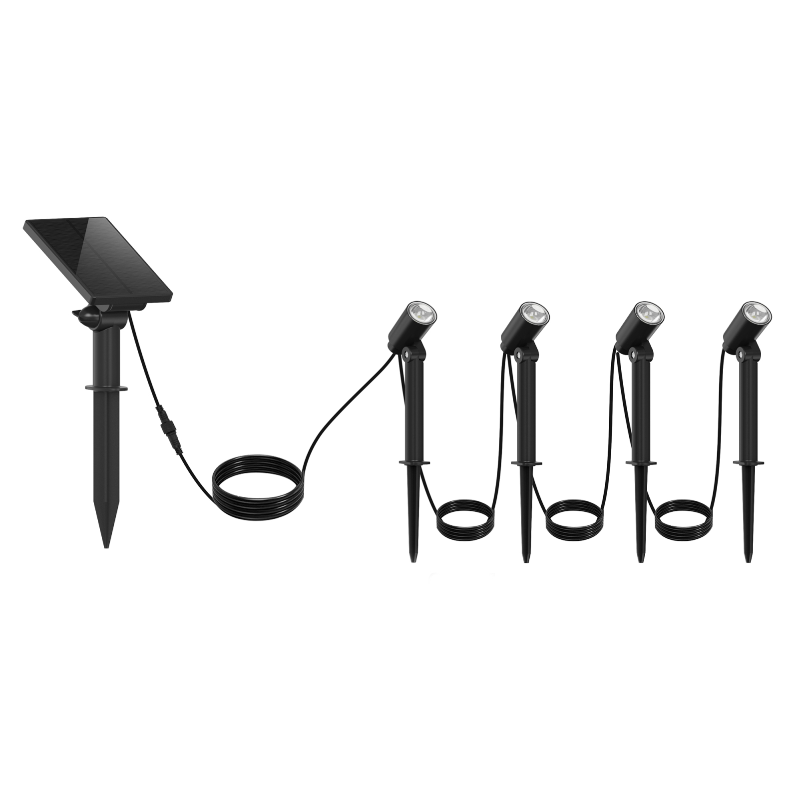 Un cablu de 2,5 m permite poziționarea flexibilă a celor patru spoturi și a panoului solar central. Perfect pentru iluminarea copacilor, a aleilor sau a teraselor. Un comutator convenabil de pornire/oprire completează produsul.